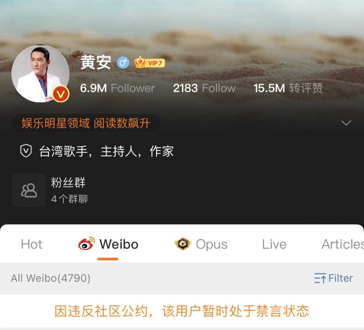 虽然他已录制视频认错道歉,但他因违反社区公约,目前遭到微博站方予以“禁言”处置。