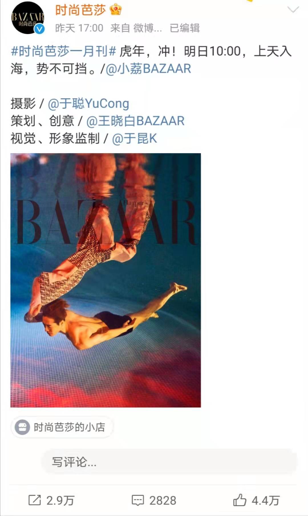 《时尚芭莎》杂志官微晒出王嘉尔一月刊封面大片,并配文:“虎年,冲!明日10:00,上天入海,势不可挡。” 封片照中,王嘉尔大秀好身材,尤其沉入水下拍摄的泳姿俨然人鱼王子,令不少网友激动地大呼心动。