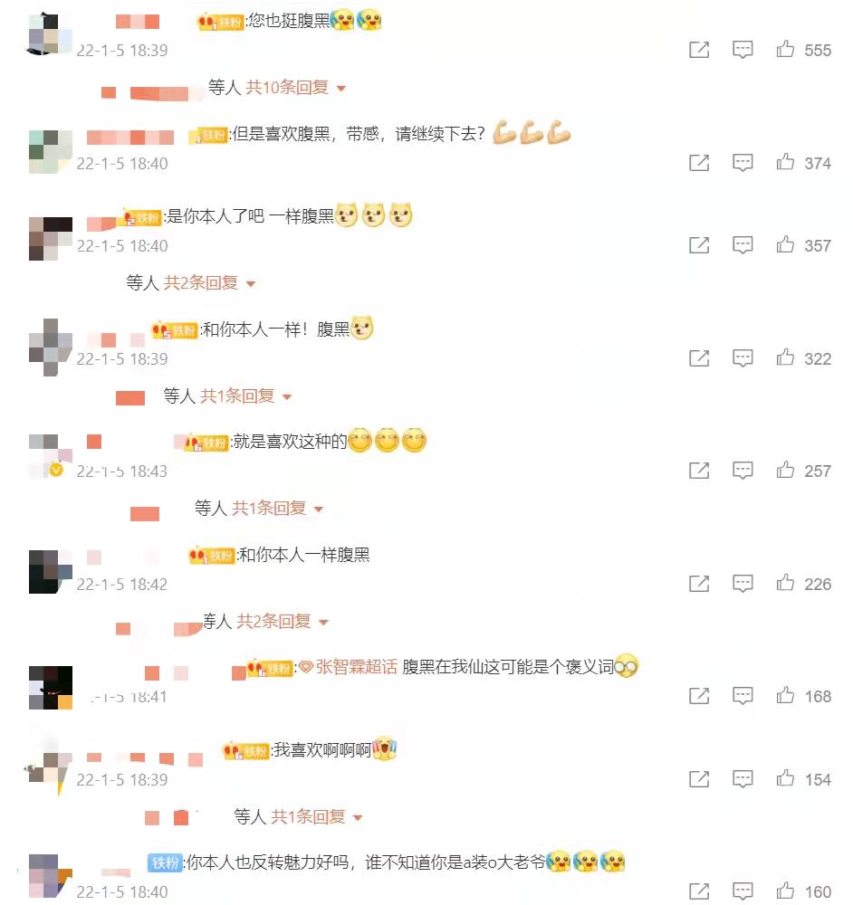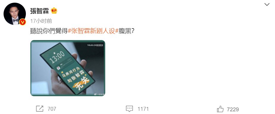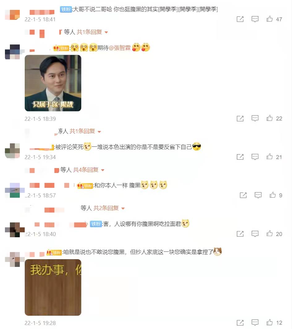 张智霖发文询问网友:“听说你们觉得张智霖新剧人设腹黑?”,还配图“马展鸿行为与张智霖无关”,被网友调侃:“您也挺腹黑”、“但是喜欢腹黑,带感,请继续下去?”、“和你本人一样腹黑”、“一堆说本色出演的你是不是要反省下自己”、“咱就是说也不敢说您腹黑,但抄人家底这一块您确实是拿捏了”等,笑翻众人。