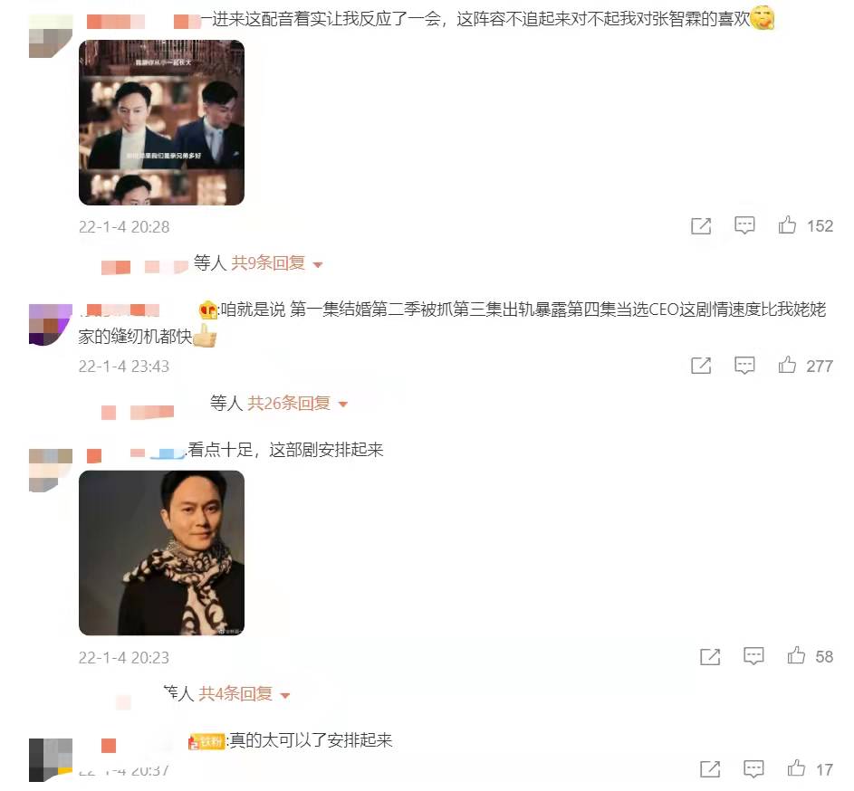 由张智霖、杨茜尧等人主演的《家族荣耀》在4日开播,目前已播出6集,演员精湛的演技加上毫不拖沓的剧情让网友表示好久都没有这种港剧了,直呼上头:“咱就是说 第一集结婚第二季被抓第三集出轨暴露第四集当选CEO这剧情速度比我姥姥家的缝纫机都快”、“这个剧真的全员恶人,集集高能!!好刺激”等。