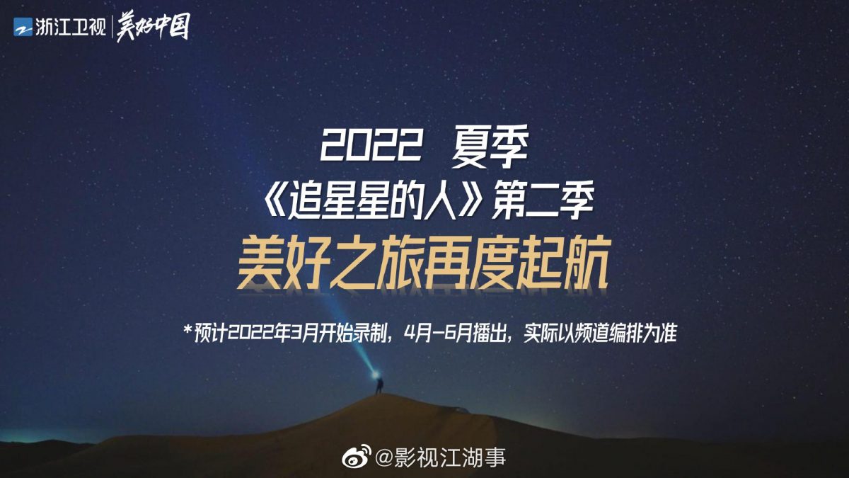 网传目前《追星星的人》第二季正在招商,预计3月份录制,并于2022年第二季度开播。吴奇隆、宋轶两人将回归担任常驻嘉宾,连同新成员范丞丞、王耀庆和魏大勋组成观星团,和三五好友享受乡村野外的静谧,追逐耀眼的梦幻星空,追求极致的轻松生活。
