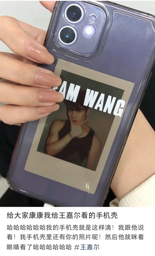 有一说一,这位偶遇嘎嘎的粉丝真的是太幸运了!偶遇王嘉尔的同时,还向对方展示了自己自制的周边产品,TEAM WANG字眼加上王嘉尔身穿黑色背心lomo照,这妥妥的小迷妹一枚!该粉丝兴奋表示,当自己向王嘉尔说手机壳里还有他的照片时,王嘉尔就眯着眼睛看了看,超级可爱!
