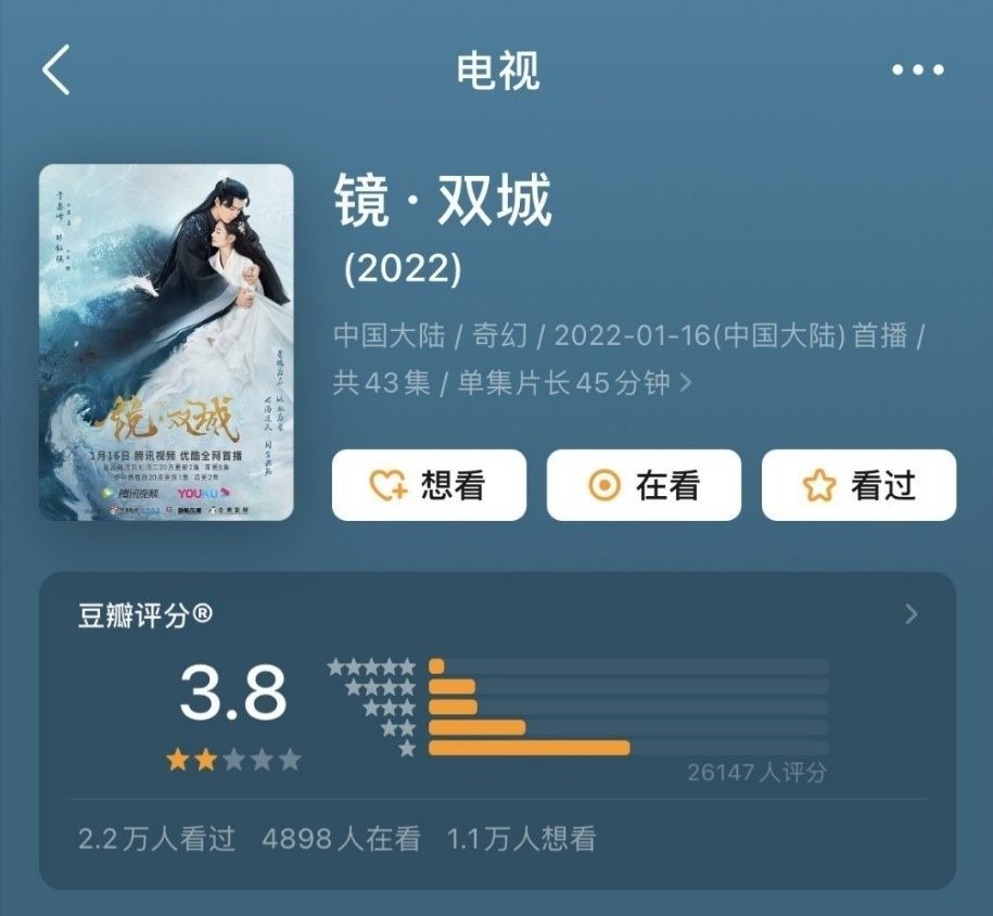截至截稿前,《镜·双城》在豆瓣开分3.8,共26147人进行评分,其中竟有半数人都只打出1星。相较于腾讯不久前推出的同类型S+级别古偶剧如《斛珠夫人》、《长歌行》等,虽然都曾遭受剧迷不同程度的吐槽,然而在豆瓣的评分都不至于像《镜·双城》如此低,恐成腾讯在豆瓣评分最不理想的S+级别古偶剧。