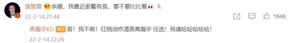搞笑的是,通过《大湾仔的夜》、厨艺有所进步的陈小春和张智霖直接在线约高瀚宇PK厨艺,直接让霸总再次变回二哈,瞬间就怂了:“哥!我不敢!”。