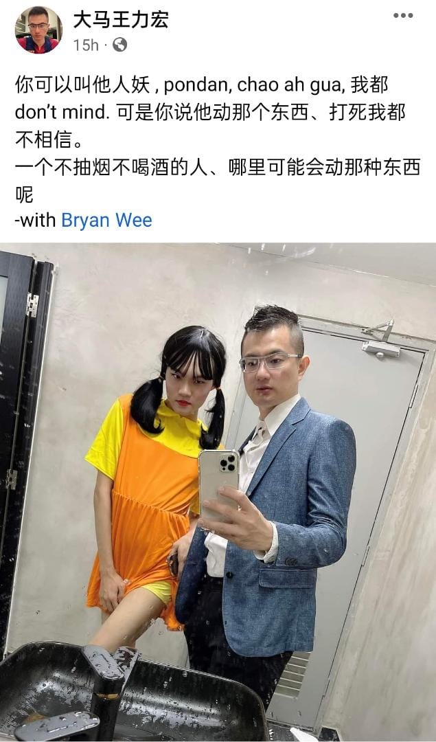 就在昨天(23日),江昭上突然恢复面子书,在另一个粉丝专页上晒出与Bryan Wee的合照声援对方:“你可以叫他人妖,pondan,chao ah gua,我都don’t mind. 可是你说他动那个东西、打死我都不相信。一个不抽烟不喝酒的人、哪里可能会动那种东西呢”。虽然他没有说明“那种东西”是什么,但网友都秒懂是“毒品”,在网上掀起热烈讨论!