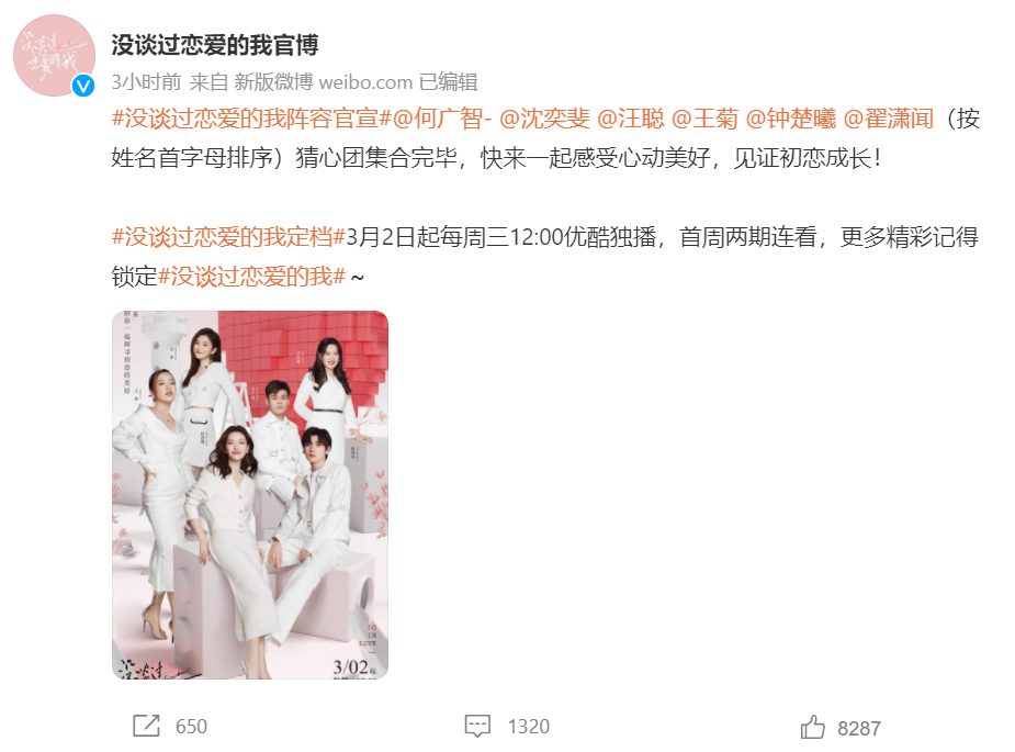 优酷综艺《没谈过恋爱的我》28日官宣“猜心团”以及素人嘉宾阵容,同时宣布定档3月2日优酷独播,邀请大家一起感受心动美好,见证初恋成长。