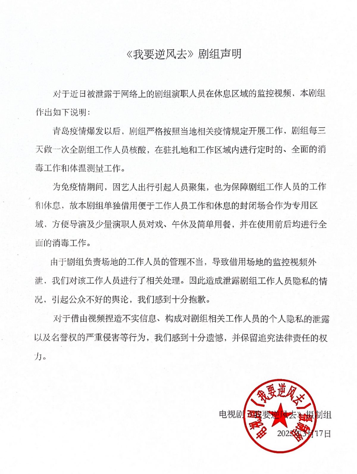 随后《我要逆风去》剧组很快就发声明澄清,表示剧组已经租下整个餐厅,让工作人员和演员们休息吃饭,“由于场地的负责人处理不当,导致视频流了出去,引发了不好的舆论,十分抱歉”。不过仍有网友不买单,认为既然是包场,为何龚俊会担心被拍、几个人还在商量坐哪不会被拍,质疑剧组找借口搪塞粉丝。