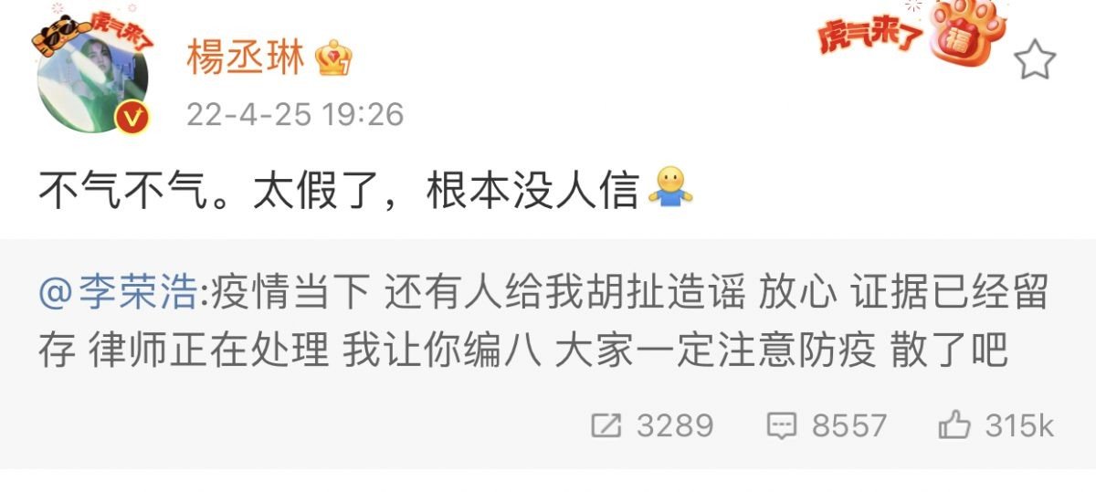 25日晚间,李荣浩透过微博发文辟谣:“疫情当下,还有人给我胡扯造谣,放心,证据已经留存,律师正在处理,我让你编八(吧),大家一定注意防疫,散了吧!”,杨丞琳随后转发该帖文霸气护夫,写道:“不气不气。太假了,根本没人信”,秒力破婚内出轨和离婚传闻。