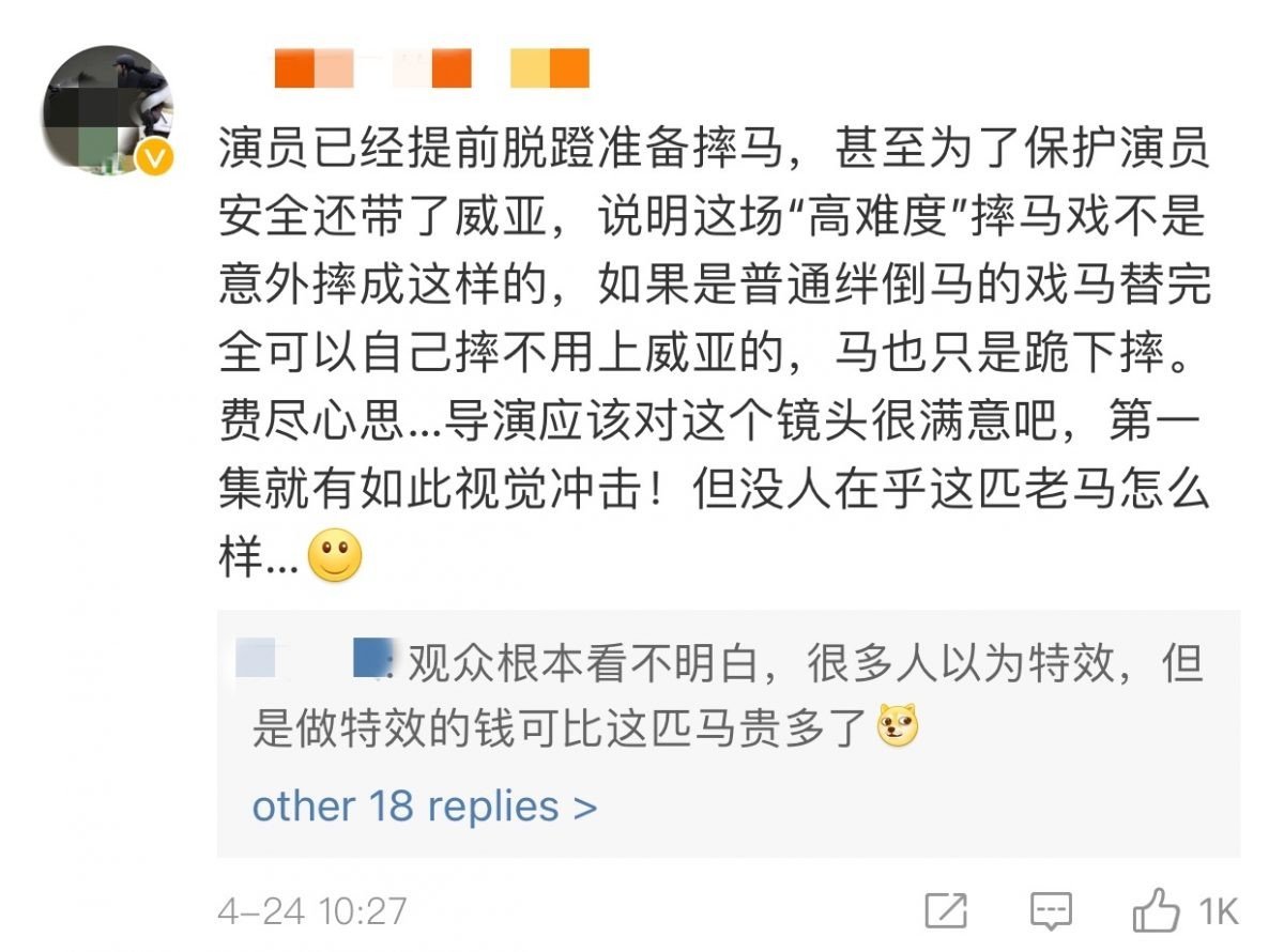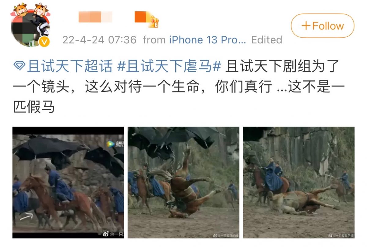 一名网友在微博上晒出三张图片,并写下:“且试天下剧组为了一个镜头,这么对待一个生命,你们真行…这不是一匹假马”。据悉,该镜头出现在第一集中,只见马匹在急速狂奔的同时,前腿被强制拉直绊倒,导致头部直接重击地面,脖子被折成一半后在原地翻滚一圈。