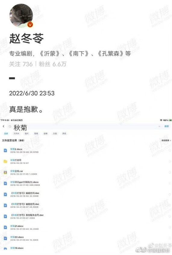 事件发酵后,有网友发现《幸福到万家》编剧赵冬苓昨(30日)晚发博写道:“真是抱歉”,并晒出2016年创作的编剧合同,《幸福到万家》原名疑似《秋菊打官司》,疑似想表达并没有针对魏大勋的意思,不过没多久该文已被删除。