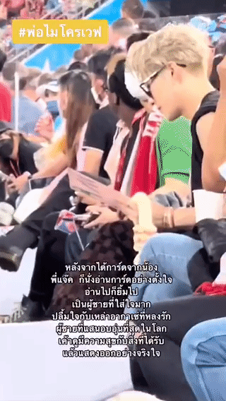 视频中,一位小男孩走向坐在舞台下的王嘉尔,并将疑似是亲手手画和手写信的礼物交给他,王嘉尔双膝下跪接过后还亲了亲小男孩的头,随即示意让他回到座位同时点头鞠躬感谢。只见王嘉尔读着的同时嘴角微微上扬,不由自主地露出了充满慈爱的笑容,融化一票粉丝的心,隔着屏幕都羡慕!
