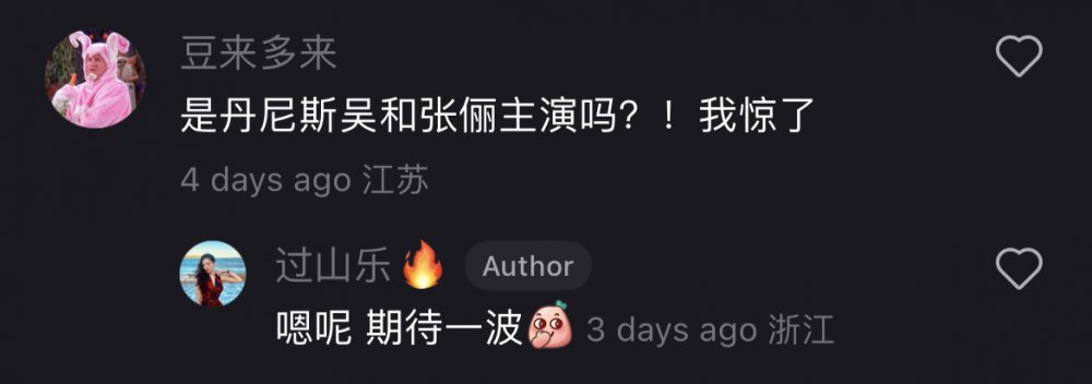 只见张俪和丹尼斯吴皆出现在照片中,而她在文案也标签了两人,让网友好奇发文:“是丹尼斯吴和张俪主演吗?!我惊了”,过山乐回复:“嗯呢 期待一波”,证实了《浪漫满屋》翻拍版的主演阵容。