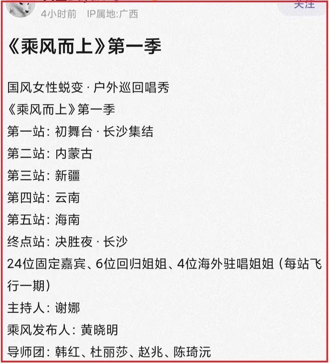 根据网上疯传的消息,《乘风而上》预计将于4月初开始录制,而且还透露了具体的模式是户外巡回唱秀,主持人是谢娜,乘风发布人是黄晓明,导师团有韩红、杜丽莎、赵兆和陈琦沅。