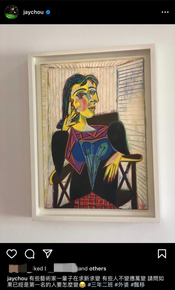 29日,周杰伦晒出一幅画作,配文:“有些艺术家一辈子在求新求变,有些人不变应万变,请问如果已经是第一名的人要怎么变”,并附上一个笑到哭的表情符号。