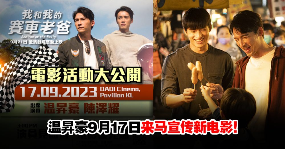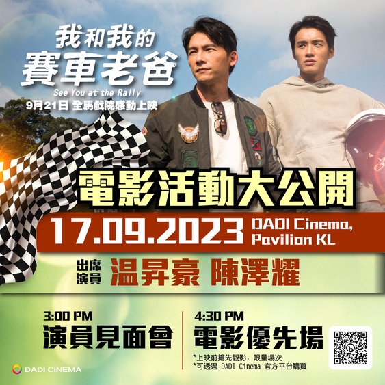 由温昇豪、陈泽耀、陈少卉领衔主演,邵雨薇特别演出,台湾影史首部结合拉力赛、亲情、友情、励志的电影《我和我的赛车老爸》,即将在9月21日于全马戏院感动上映。不仅如此,主演温昇豪将于9月17日再次莅临马来西亚,与陈泽耀(阿哲)出席演员见面会与电影优先场与大家见面!这是一个难得的机会,大家不要错过!