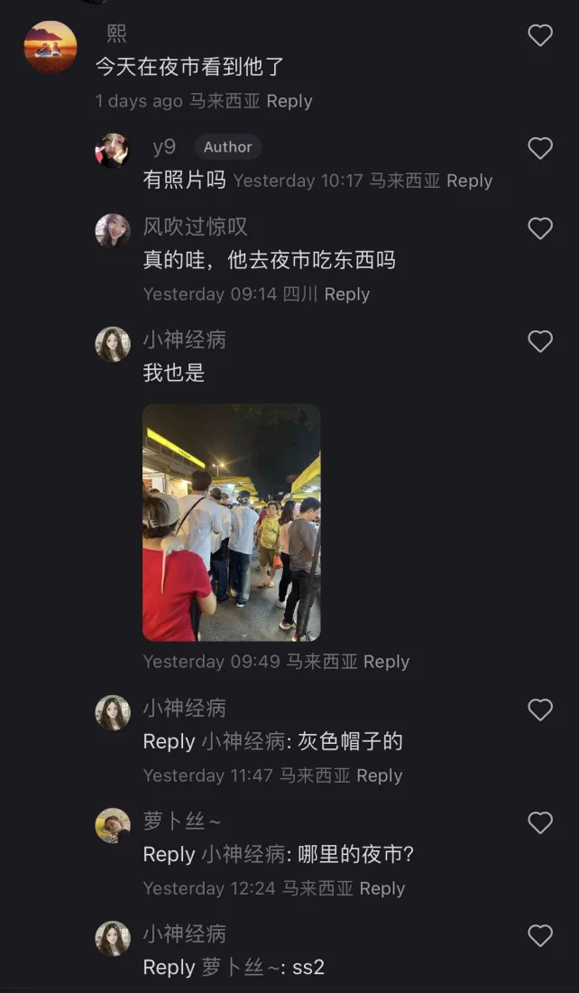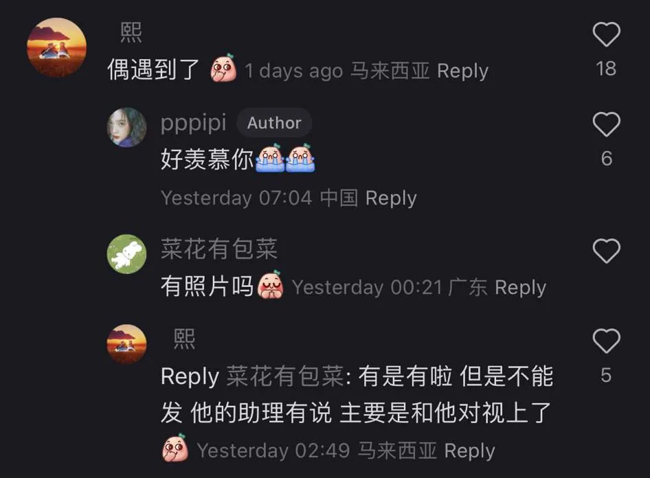 另外,有小红书网民晒出在SS2夜市偶遇黄明昊的背影照片,也有人表示自己遇到了并拍下照片,但其助理示意不能公开,让粉丝直呼“很羡慕”、“我的天我昨天也去了那附近”、“就我没偶遇是吧,好羡慕”、“我怎么都偶遇不到啊”。