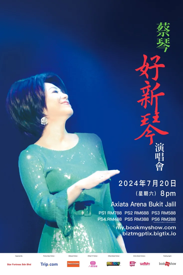 蔡琴《好新琴》马来西亚演唱会将于2024年7月20日(星期六),晚上8时在Axiata Arena Bukit Jalil举行。 演唱会门票将于3月15日上午11点起,在 Trip.com 优先售票;3月16日上午11点开始,在指定官方网站正式公开售票;演唱会价分别为788令吉(PS1)、688 令吉(PS2)、588令吉(PS3)、488令吉(PS4)、388令吉(PS5)以及288令吉(PS6)。 凡于15日在Trip.com 及16、17日在 biztmgptix.bigtix.io 购票即可享有5%折扣优惠。 欲了解更多购票详情,请浏览 Trip.com 、my.bookshow.com 以及 biztmgptix.bigtix.io 官方售票网站。