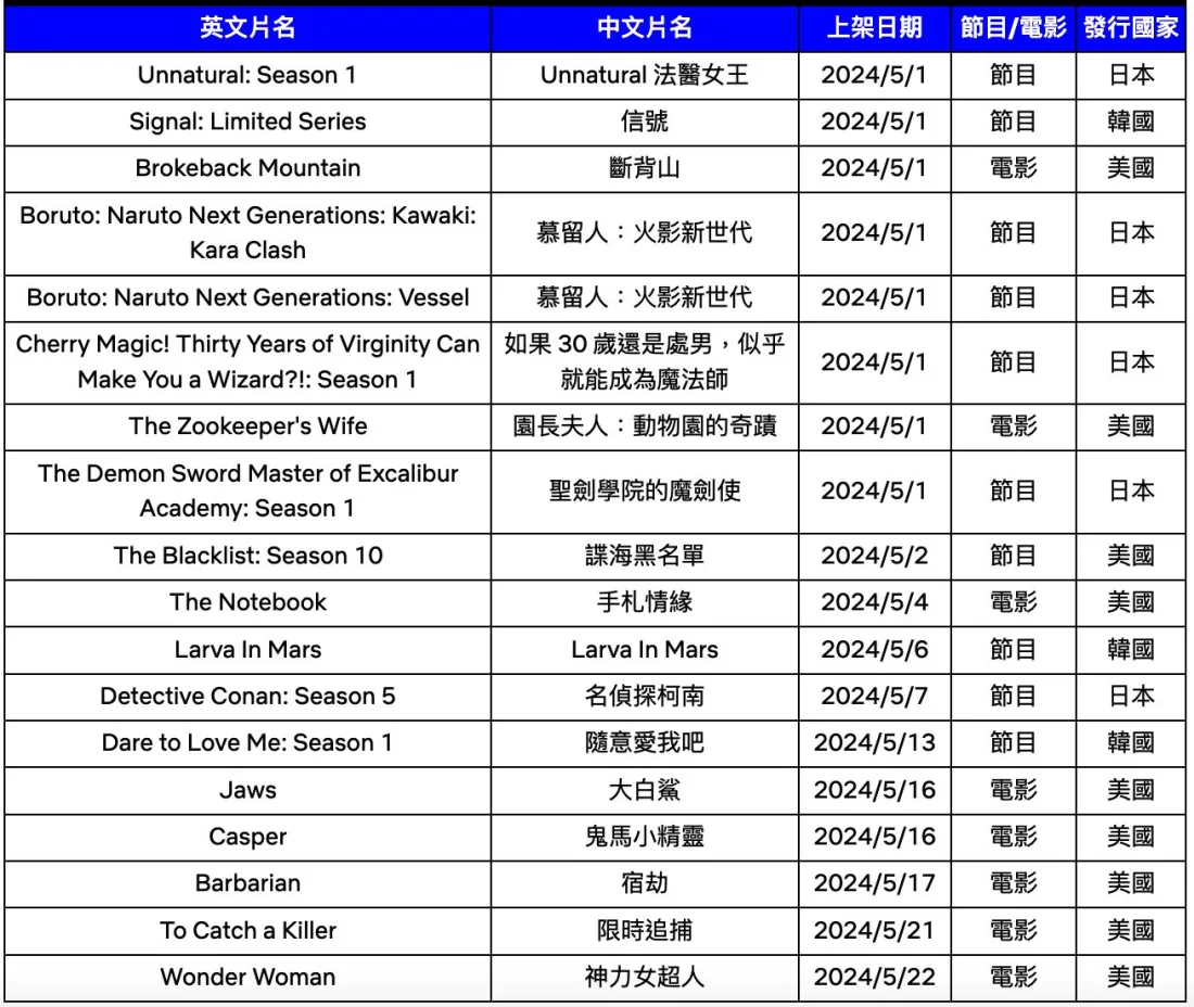 Netflix 五月份其他的影片清单: