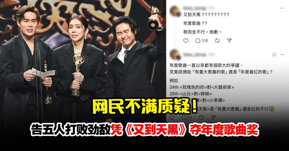 台湾超人气乐团告五人出道7年来首次镀金,以大热姿态打败张惠妹、杨乃文、灭火器、热狗、草东没有派对等实力唱将,凭《又到天黑》夺下本届金曲奖年度歌曲奖殊荣,不料却引起极大争议!