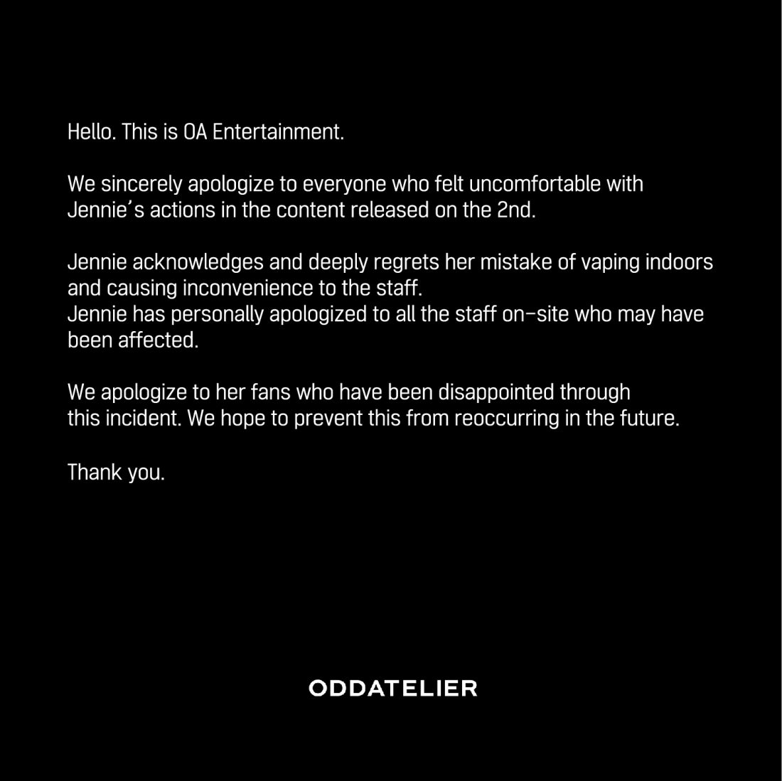 对此,Jennie的经纪公司ODD ATELIER今(9日)午发布声明,表示Jennie承认室内吸烟的错误行为,也已亲自向可能受影响的现场工作人员道歉,“我们对这次事件感到失望的粉丝们道歉,也希望防止这种情况在未来再次发生。”