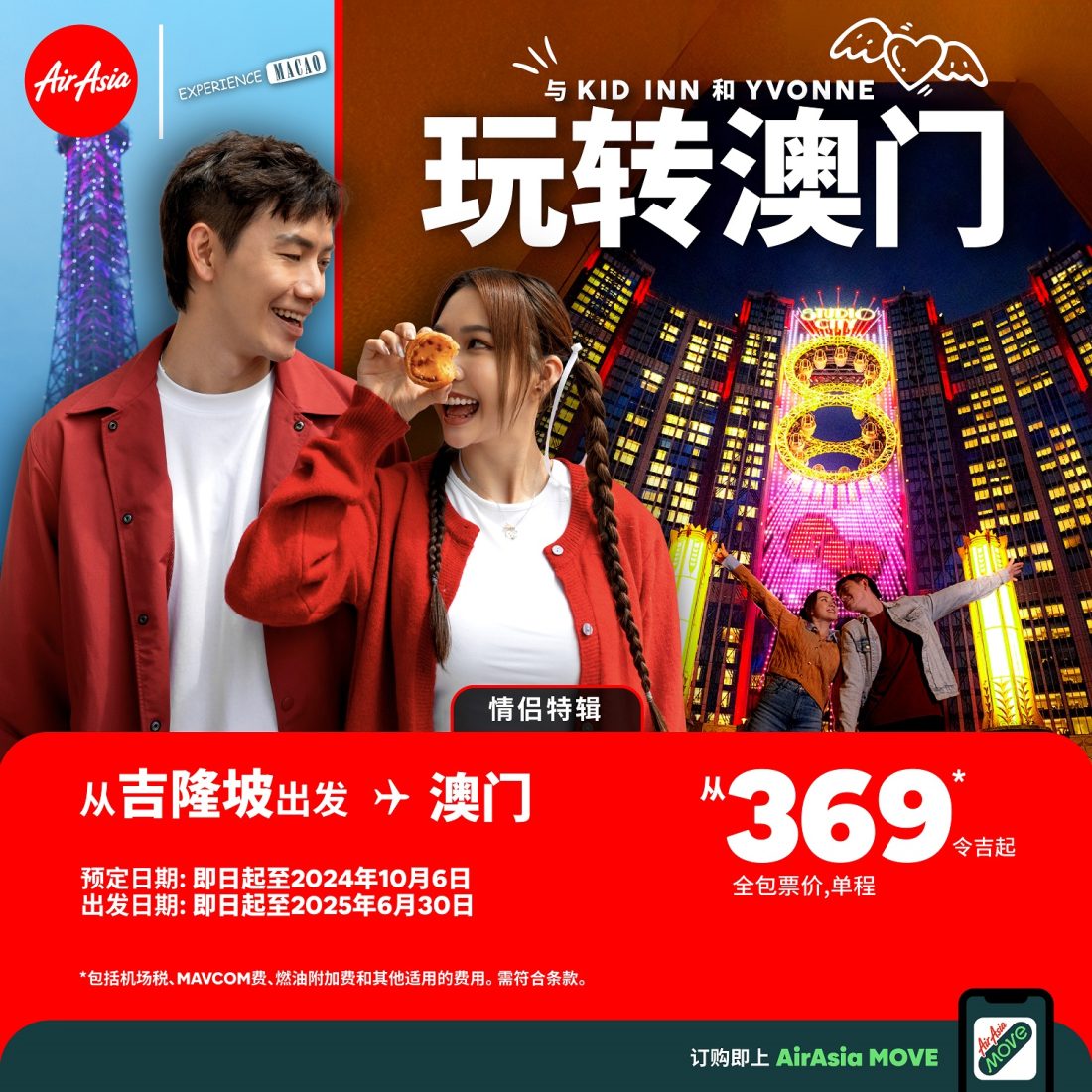 AirAsia目前推出优惠促销,从即日起到2024年10月6日,只要在官网预定从吉隆坡飞往澳门的机票,单程票价最低只需RM369*起!