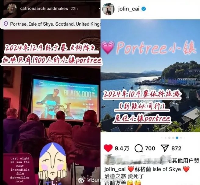 此外,蔡依林去年10月分享自己到英国苏格兰高地Portree小镇旅行,并表示此趟是“疗愈之旅,爱死了”。两个月后,彭于晏主演的电影《狗阵》便在这个仅有1900人口的小镇加映,种种迹象引发联想。