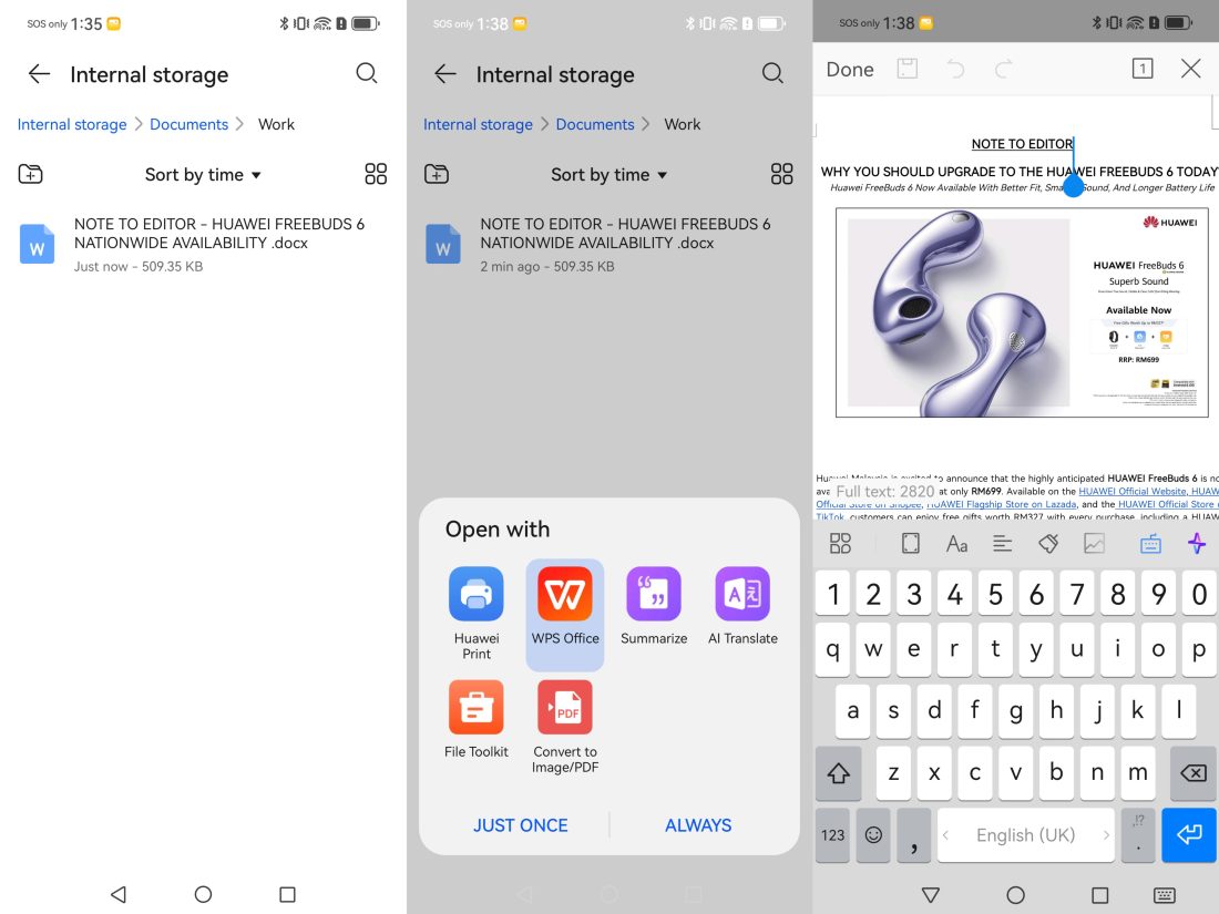用法很简单,当你在File应用中开启文件时,选用 WPS Office 来打开,很快地就能使用注解或签名工具去完成任务,不用去特地打开电脑做这做那的。