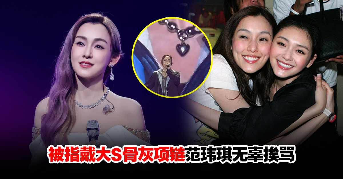 范玮琪演出结束后,有陆媒声称她佩戴的正是大S骨灰项链,相关话题也迅速冲上微博热搜,引发争议。中国网民纷纷炮轰她不尊重逝者,身为闺蜜更不该消费逝者。但很快有网民查出,该项链其实是瑞典品牌Acne Studios的成品饰品,造型与小S所戴的细链小爱心骨灰项链明显不同。