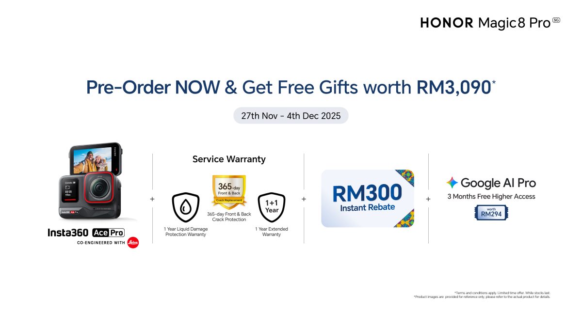 HONOR Magic8 Pro现已正式开放预购!即日起至2025年12月4日,凡预订 HONOR Magic8 Pro的用户,即可免费获赠价值高达RM3,090的豪华大礼包,当中就包括了专业级 Insta360 Ace Pro 运动相机、365天前后屏摔损保障、一年延长保修和一年进水保修。此外,预购用户还可获得为期3 个月价值 RM294 的Google AI Pro 访问权限。