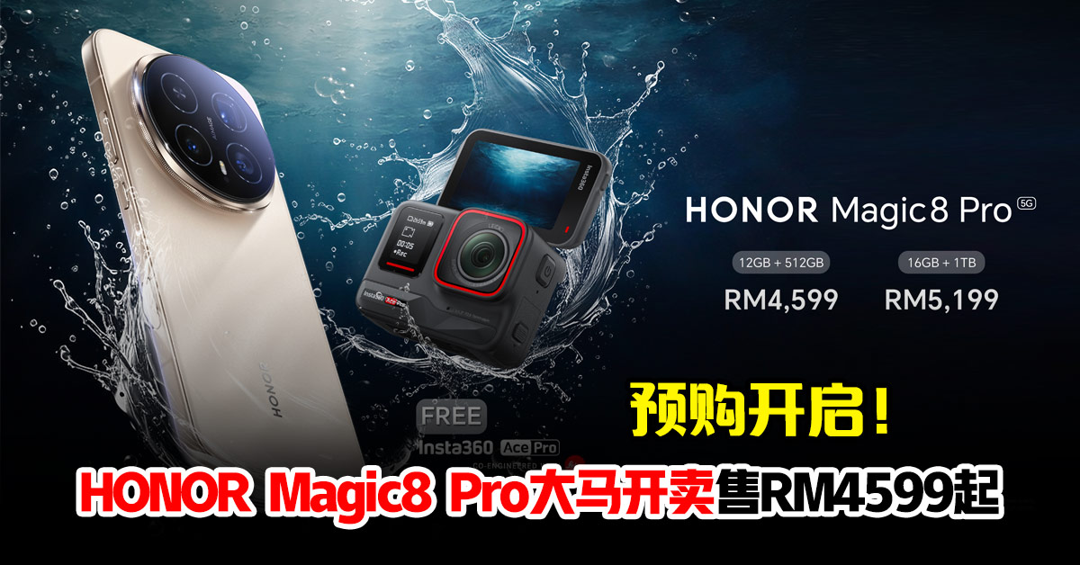 HONOR Magic8 Pro现已正式开放预购!即日起至2025年12月4日,凡预订 HONOR Magic8 Pro的用户,即可免费获赠价值高达RM3,090的豪华大礼包,当中就包括了专业级 Insta360 Ace Pro 运动相机、365天前后屏摔损保障、一年延长保修和一年进水保修。此外,预购用户还可获得为期3 个月价值 RM294 的Google AI Pro 访问权限。