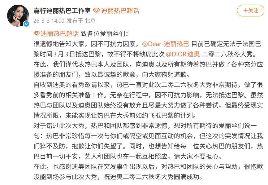 中国女星迪丽热巴原定于法国巴黎时间3月3日出席迪奥(DIOR)2026秋冬大秀,然而工作室稍早发布致歉声明,称热巴“因不可抗力因素”,不得不缺席时装周。